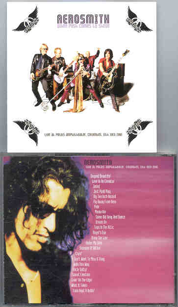 The vocals are very strong but the guitars and the bass are very hard to hear. The front cover has the picture from inside the Just Push Play booklet, except with a white background. There are four Aerosmith logos, one in each corner. In the middle along the top it says “Aerosmith When Push Comes to Shove” and on the bottom it says “Live at Polaris Amphitheater, Columbus, 11th July 2001”. On the reverse of the front cover it has half of a picture of Steven sucking a candy cane with the track list going down the side of his face. The inside of the front cover is littered with pictures from the concert with a black Aerosmith logo in the background. Both CD’s have the same picture on them. Steven leaning next to Joe. The back cover has a picture of Joe Cut in half with the track list along side him. The back cover facing inside has a picture of Joe from the “Pink” music video. I’m not sure what the label of the CD is because there is not one listed on the case anywhere.