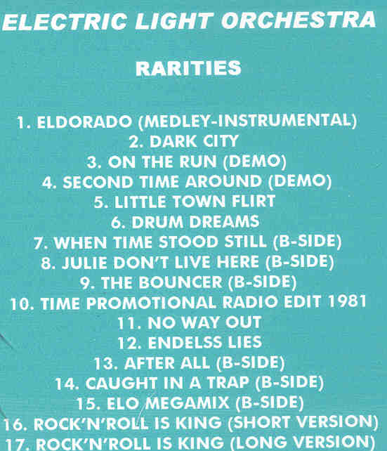 1. ELDORADO (MEDLEY-INSTRUMENTAL) 2. DARK CITY 3. ON THE RUN (DEMO) 4. SECOND TIME AROUND (DEMO) 5. LITTLE TOWN FLIRT 6. DRUM DREAMS 7. WHEN TIME STOOD STILL (B-SIDE) 8. JULIE DON’T LIVE HERE (B-SIDE) 9. THE BOUNCER (B-SIDE) 10. TIME PROMOTIONAL RADIO EDIT 1981 11. NO WAY OUT 12. ENDELSS LIES 13. AFTER ALL (B-SIDE) 14. CAUGHT IN A TRAP (B-SIDE) 15. ELO MEGAMIX (B-SIDE) 16. ROCK’N’ROLL IS KING (SHORT VERSION) 17. ROCK’N’ROLL IS KING (LONG VERSION