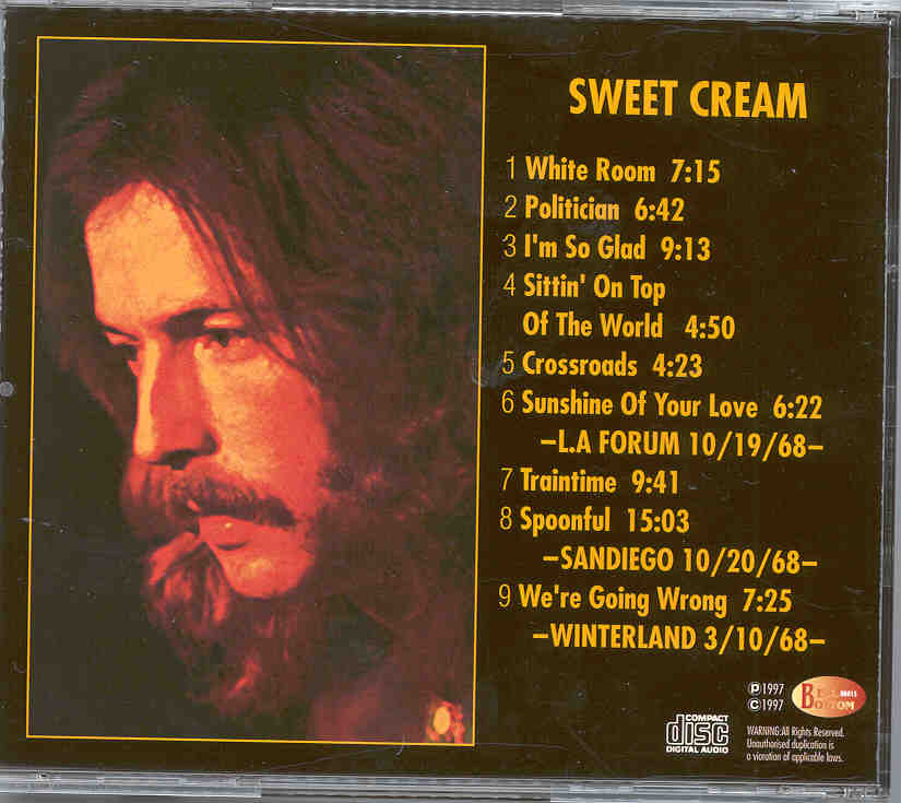 1 White Room 7:15 2 Politician 6:42 3 I’m So Glad 9:13 4 Sittin’ On Top Of The World 4:50 5 Crossroads 4:23 6 Sunshine Of Your Love 6:22 —L.A FORUM 10/19/68-7 Traintime 9:41 8 Spoonful 15:03 —SANDIEGO 10/20/68-9 We’re Going Wrong 7:25 —WINTERLAND 3/10/68—