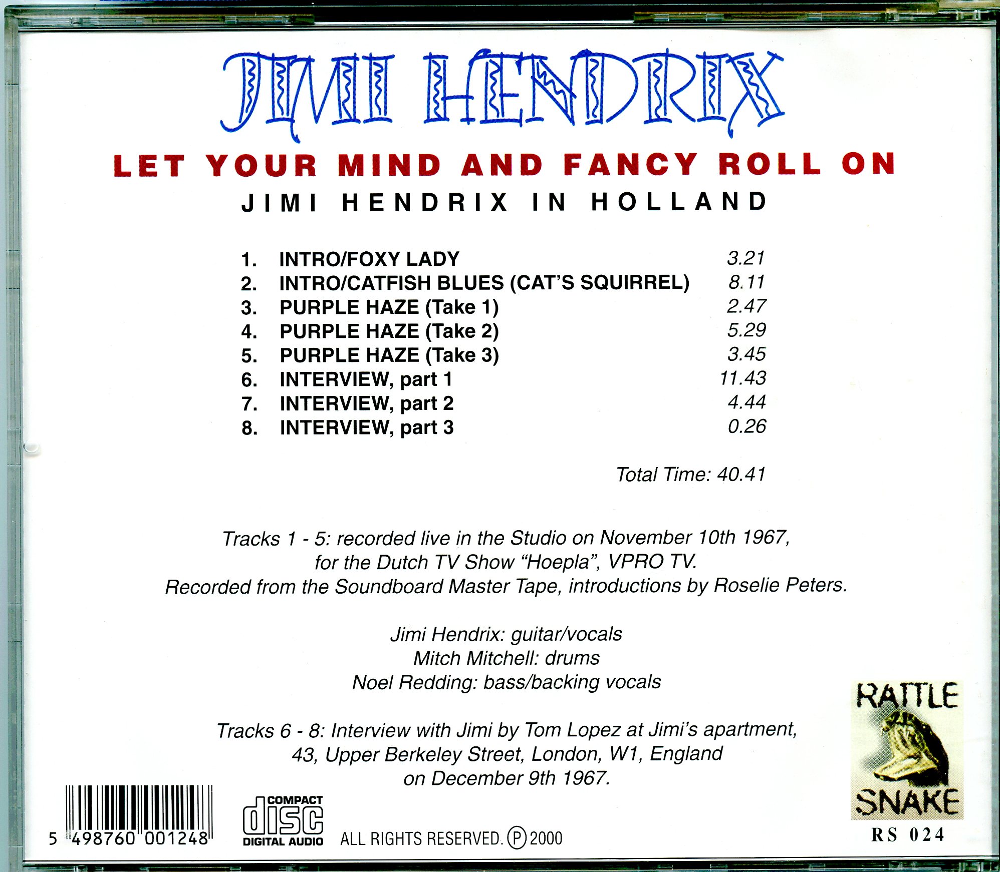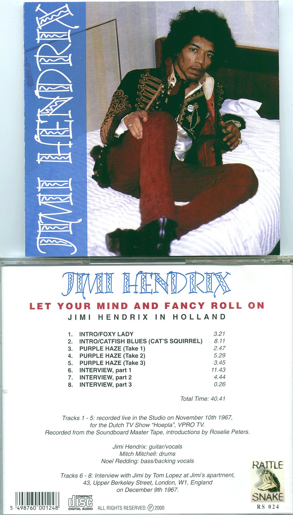 JIMI HENDRIX Let Your Mind and Fancy Roll On 1 CD Jimi Hendrix in Holland Rattle Snake Live in the Studio on Nov 10th 1967 for the Dutch TV Show Hoepla JIMIHENDRIX Let Your Mind and Fancy Roll On ( 1 CD ) ( Jimi Hendrix in Holland ) ( Rattle Snake ) ( Live in the Studio on Nov 10th, 1967 for the Dutch TV Show Hoepla )