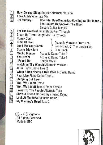 How Do You Sleep Shorter Alternate Version Look At Me Alternate Mix J-9 Medley – Beautiful Boy/Memories-Howling At The Moon-/ The Dakota Rap/Across The River Electric Guitar Medley I’m The Greatest Final StudioRun Through Clean Up Time Rough Mix Early Vocal Honey Don’t Glad All Over Acoustic Versions From The Lend Me Your Comb Soundtrack Of The Unreleased Duane Eddy Jam Film Clock Mucha Mungo Acoustic Demo Take 2 # 9 Dream Acoustic Demo Take 2 I Found Out Rough Mix 2 Watching The Wheels Alternate Version Julia Early Demo Take 2 When A Boy Needs A Girl 1970 Acoustic Demo Real Live Piano Demo Take 2 Stepping Out Take 1 Well Well Well Demo Well Well Well Take 4 From Acetate Power To The People Alternate Take She’s A Friend Of Dorothy’s Piano Demo Look At Me 1968 Acoustic Demo My Mymmy’s Dead Take 2