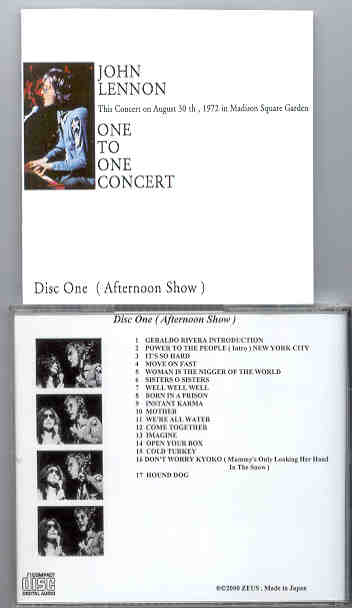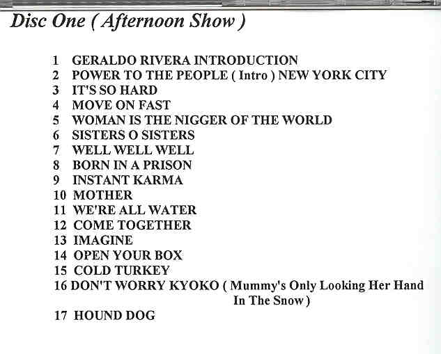 1 GERALDO RIVERA INTRODUCTION 2 POWER TO THE PEOPLE ( Intro ) NEW YORK CITY 3 IT’S SO HARD 4 MOVE ON FAST 5 WOMAN IS THE NIGGER OF THE WORLD 6 SISTERS 0 SISTERS 7 WELL WELL WELL 8. BORN IN A PRISON 9 INSTANT KARMA 10 MOTHER 11 WE’RE ALL WATER 12 COME TOGETHER 13 IMAGINE 14 OPEN YOUR BOX 15 COLD TURKEY 16 DON’T WORRY KYOKO (Mummy’s Only Looking Her Hand In The Snow ) 17 HOUND DOG