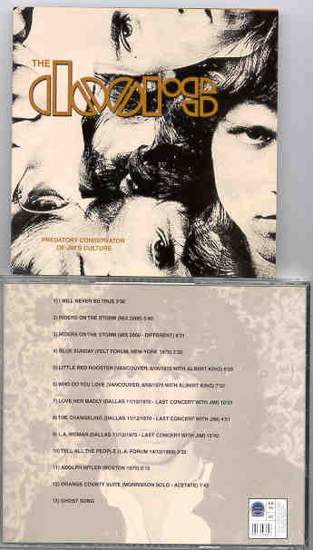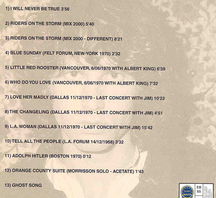 1) I WILL NEVER BE TRUE 3’56 2) RIDERS ON THE STORM (MIX 2000) 540 3) RIDERS ON THE STORM (MIX 2000 – DIFFERENT) 8’21 4) BLUE SUNDAY (FELT FORUM, NEW-YORK 1970) 2’32 5) LITTLE RED ROOSTER (VANCOUVER, 6/06/1970 WITH ALBERT KING) 6’39 6) WHO DO YOU LOVE (VANCOUVER. 6/06/1970 WITH ALBERT KING) 7’32 7) LOVE HER MADLY (DALLAS 11/12/1970 – LAST CONCERT WITH JIM) 10’23 8) THE CHANGELING (DALLAS 11/12/1970 – LAST CONCERT WITH JIM) 4’51 9) L.A. WOMAN (DALLAS 11/12/1970 – LAST CONCERT WITH JIM) 1542 10)TELL ALL THE PEOPLE (LA. FORUM 14/12/1968) 3’32 11) ADOLPH HITLER (BOSTON 1970) 0’12 12) ORANGE COUNTY SUITE (MORRISSON SOLO – ACETATE) 1’43 13) GHOST SONG